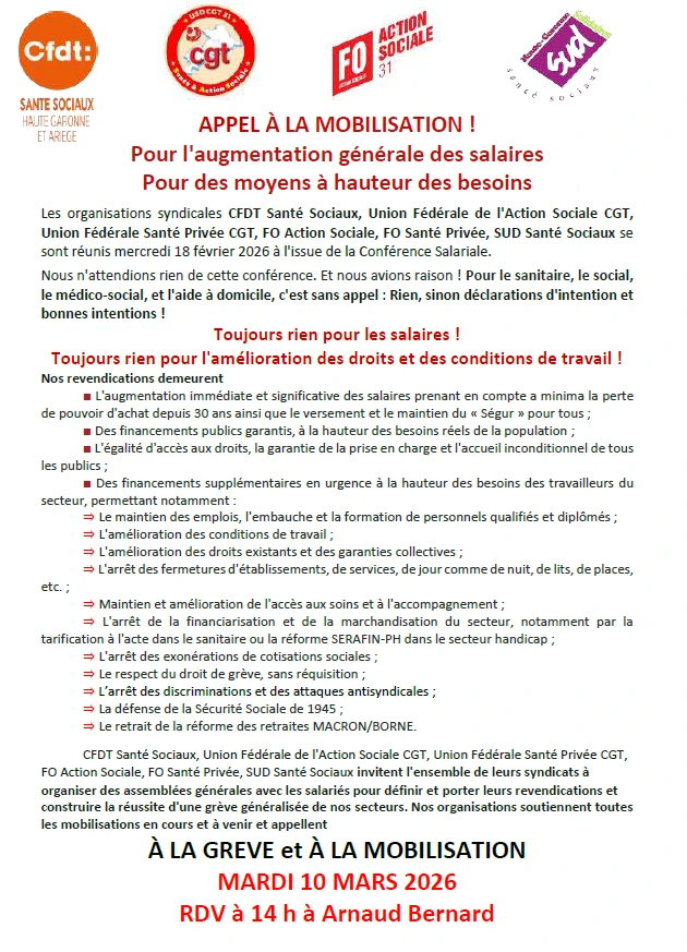 Dans le cadre de la journée nationale de mobilisation du 10 mars, l'intersyndicale appelle à une manifestation à Toulouse, à 14h à Arnaud Bernard