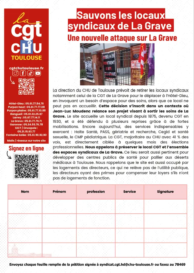Pour toutes ces raisons, nous appelons à la mobilisation pour le maintien du local CGT de La Grave et nous souhaitons aussi que toutes les organisations syndicales du CHU de Toulouse gardent leur local à La Grave. Enfin La Grave serait un lieu idéal sur les espace restants dédiés aux soins pour installer des centres publics de santé pour pallier aux déserts médicaux toulousains. Nous vous tiendrons informés d’un rassemblement dans les plus brefs délais. Signez notre pétition : https://c.org/NdFnRMZHt7